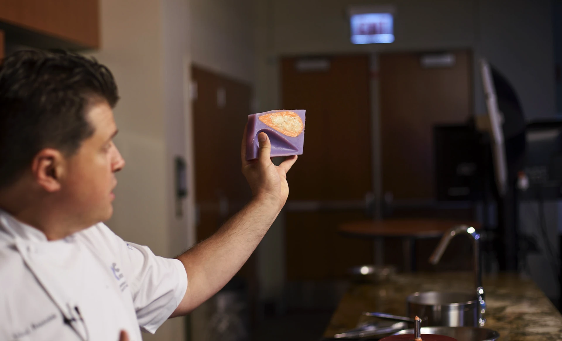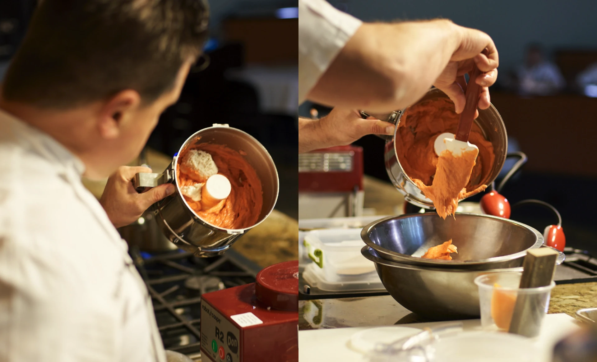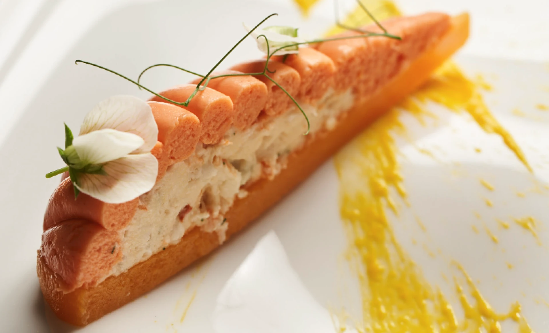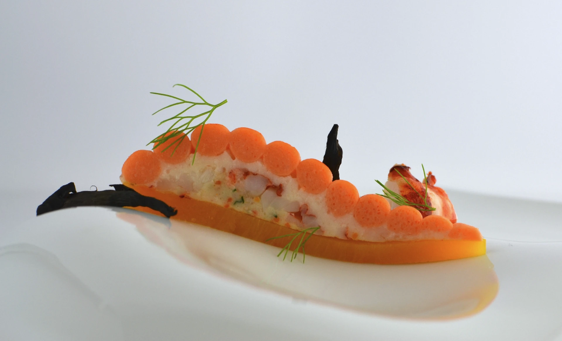 It was a preparation that drew the attention of veteran competitor Rasmus Kofoed for its structural precision and technical clarity. Sculpted to resemble a lobster tail, the dish highlights disciplined forcemeat technique and the controlled blanching of lobster to extract vivid shell pigmentation before emulsification. The mousse is piped into vinyl tubing, gently poached, assembled in a custom silicone mold, and mounted over sous-vide butternut squash to balance richness with acidity and structural stability.