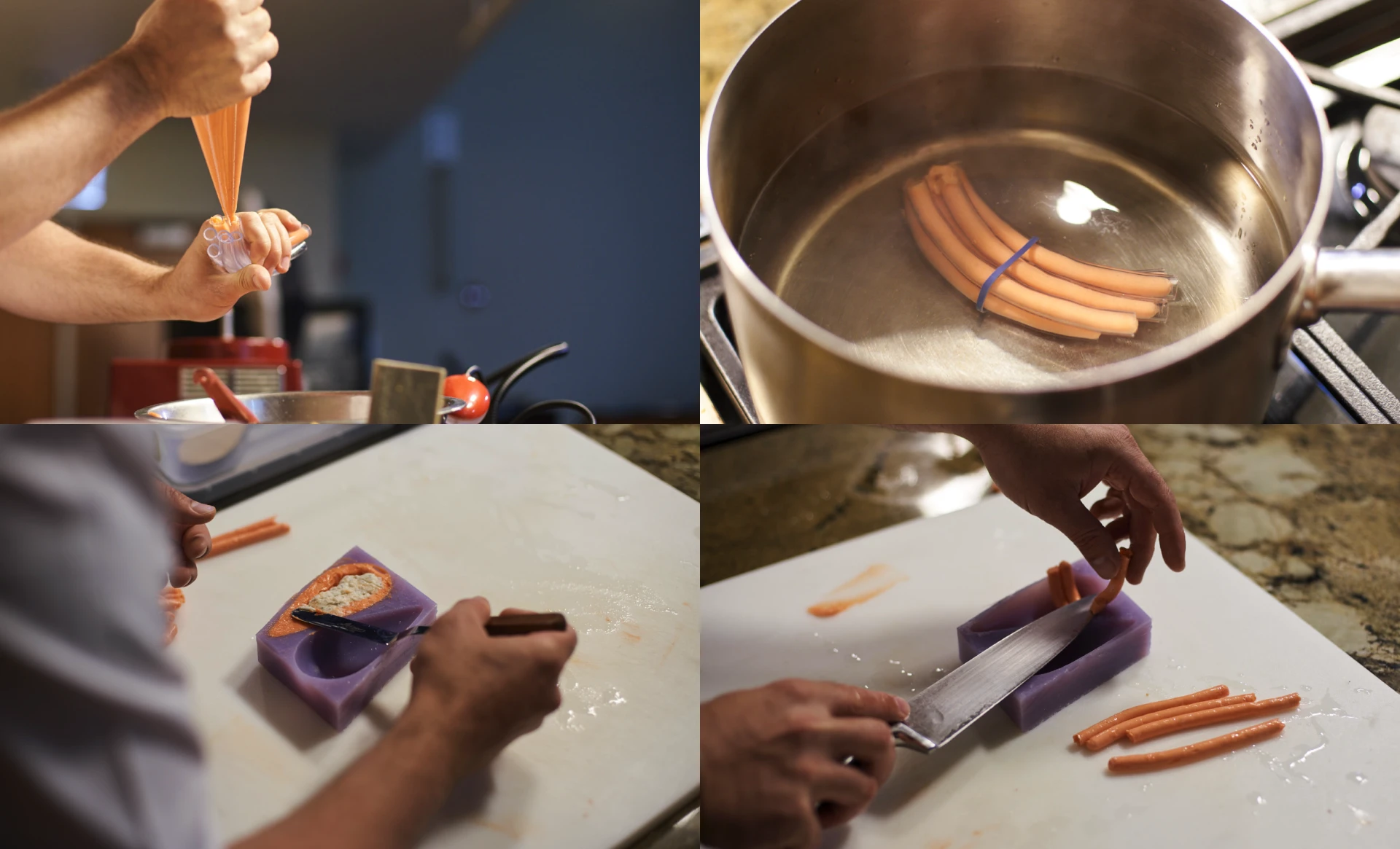Pipe lobster mousse into ¾-inch vinyl tubing, eliminating air pockets. Secure ends with elastic bands.