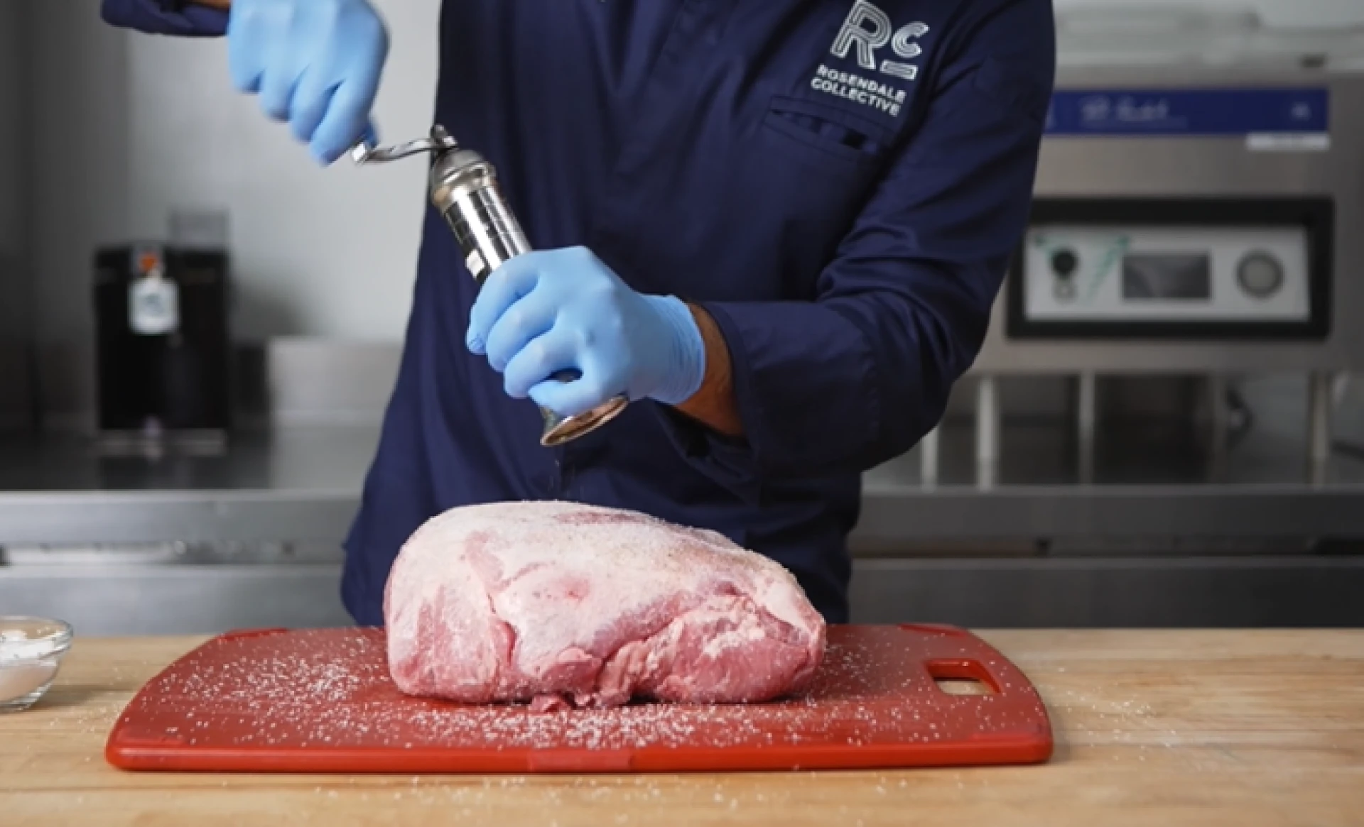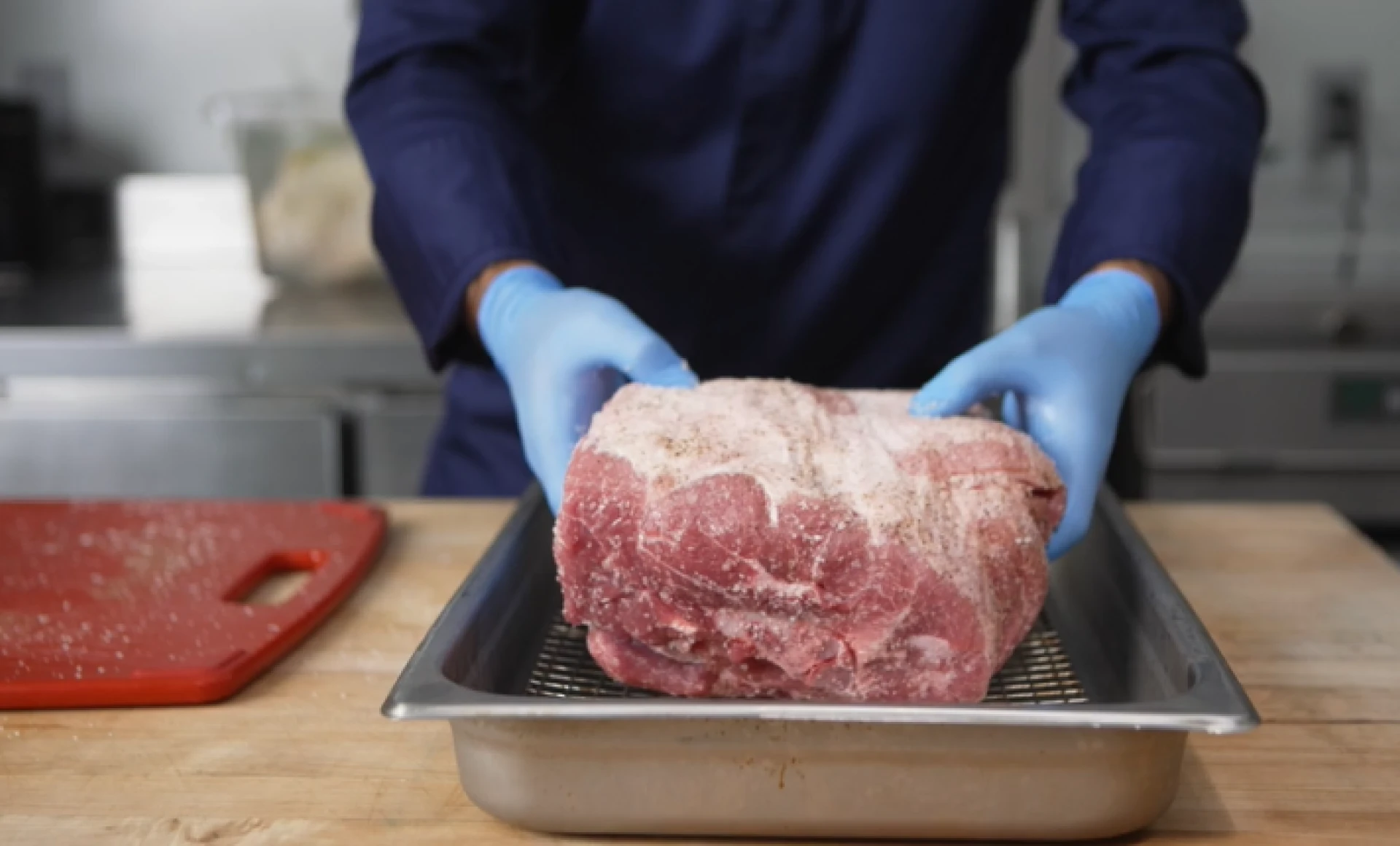 After the pork has been seared, cool down by chilling in a blast chiller until thoroughly chilled. We use a Multifresh Irinox blast chiller.