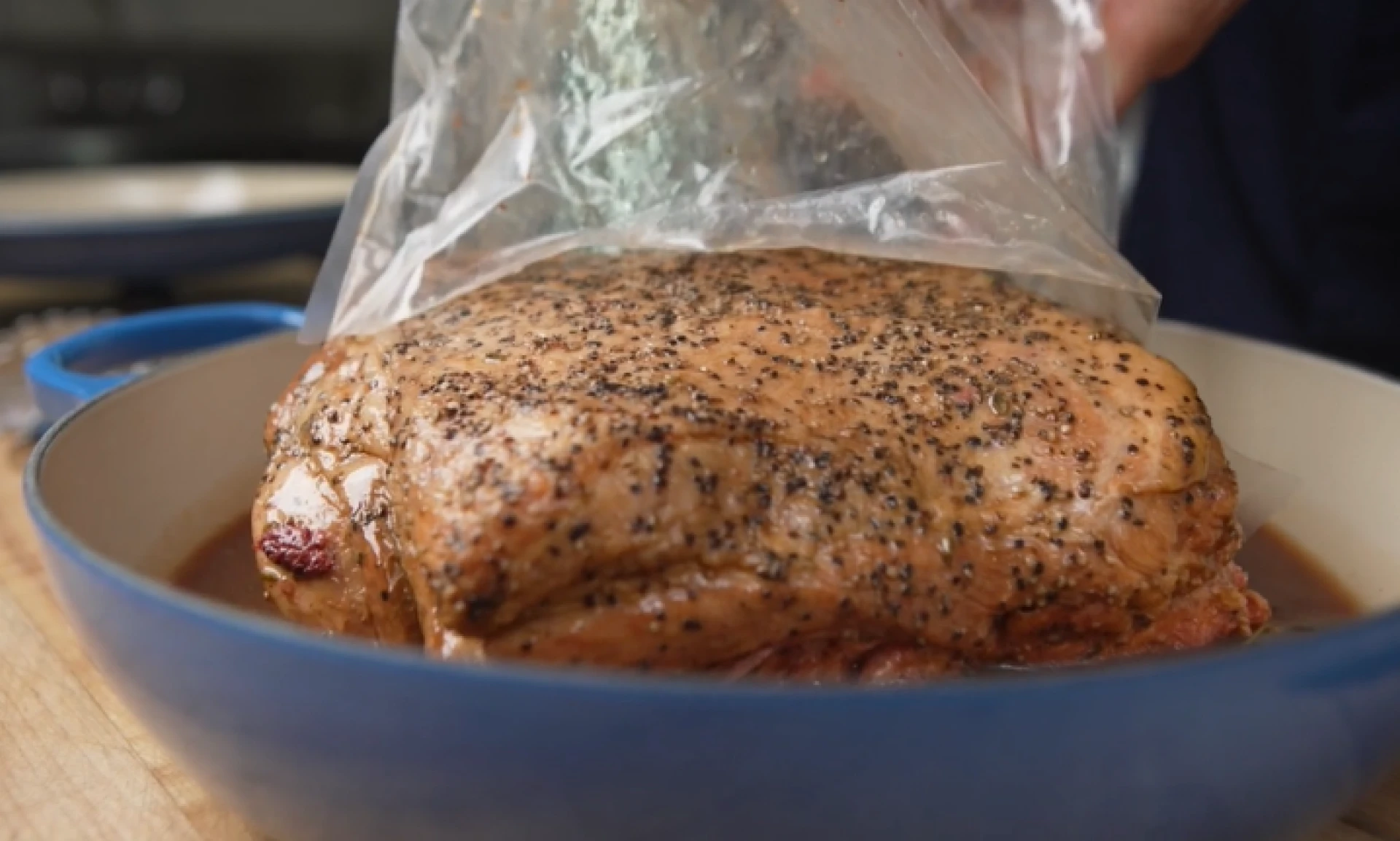 Next, place the chilled pork in a large enough bag to fit the entire shoulder in. Add the fresh herbs on top of the pork and the fortified veal stock. Please note that you can undoubtedly use reduced chicken stock or any strong in place of the veal stock. The key is that it is rich in gelatin.