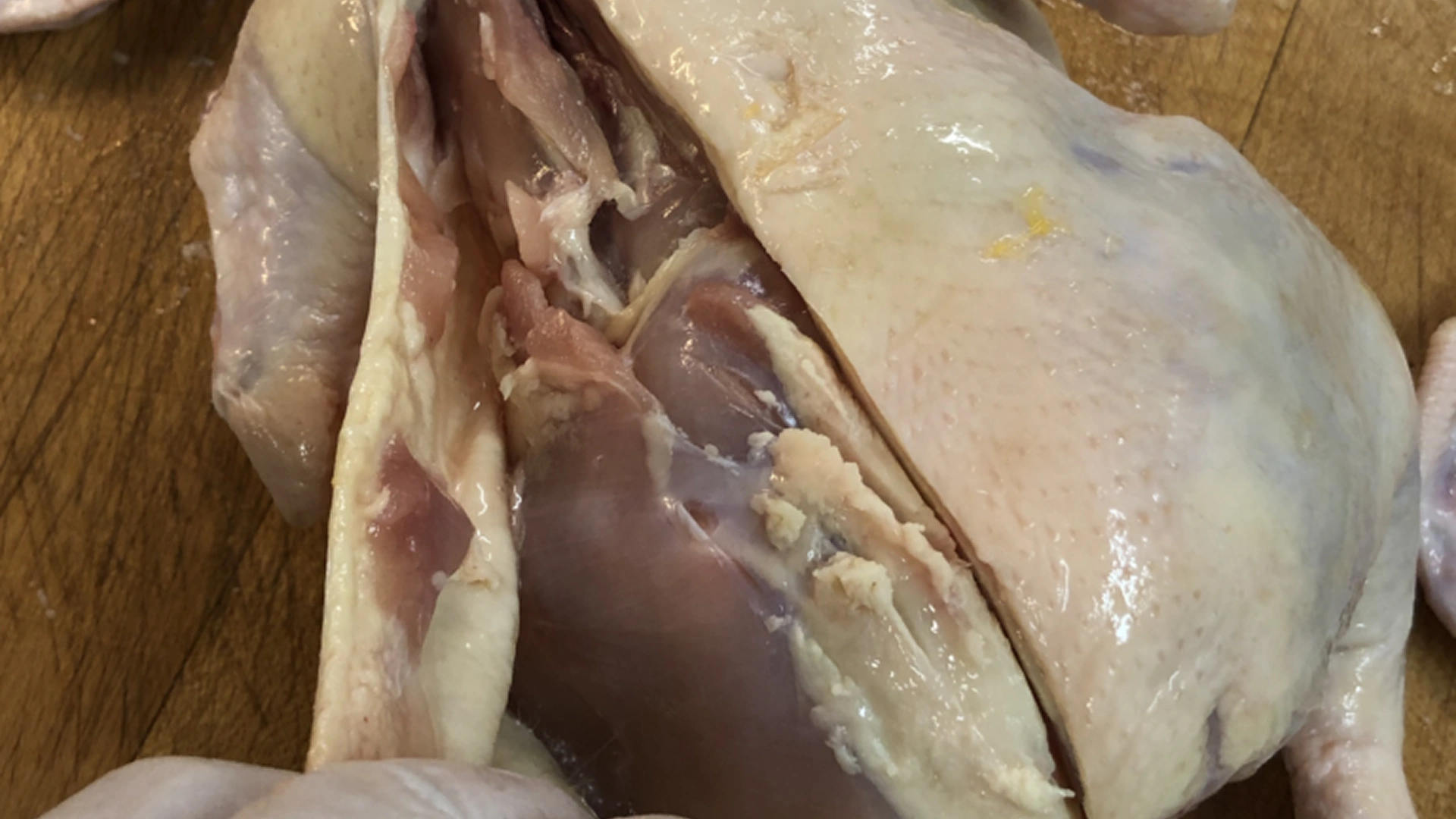 Thoroughly rinse chickens and pat dry. With a carving knife, remove the wingtips and make a cut along the back of the chicken from the neck down to the tail. Carefully remove the skin, pulling it away from the carcass and over the back, then over the wings and thighs. Be very careful not to damage or puncture the skin with the knife.