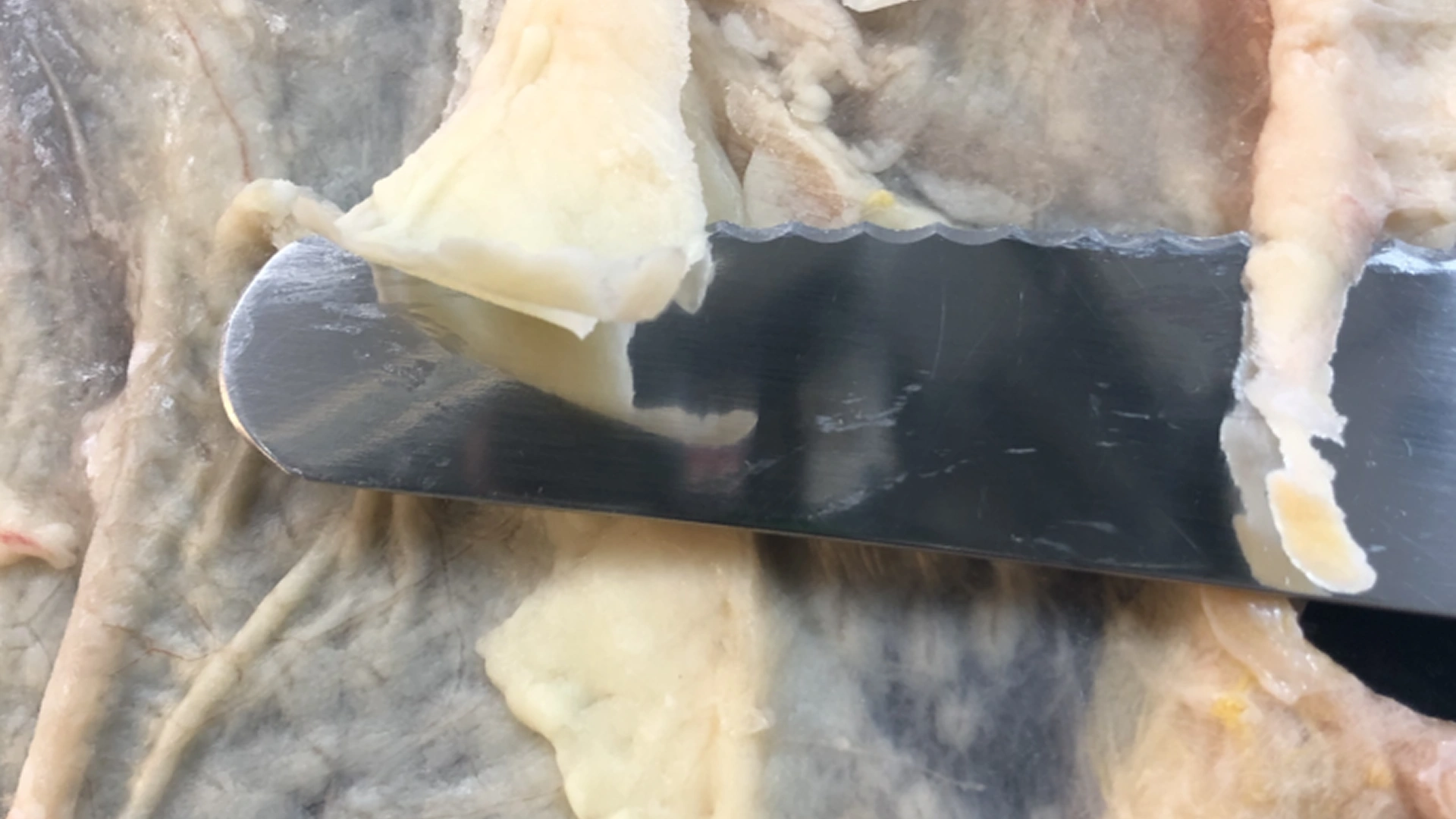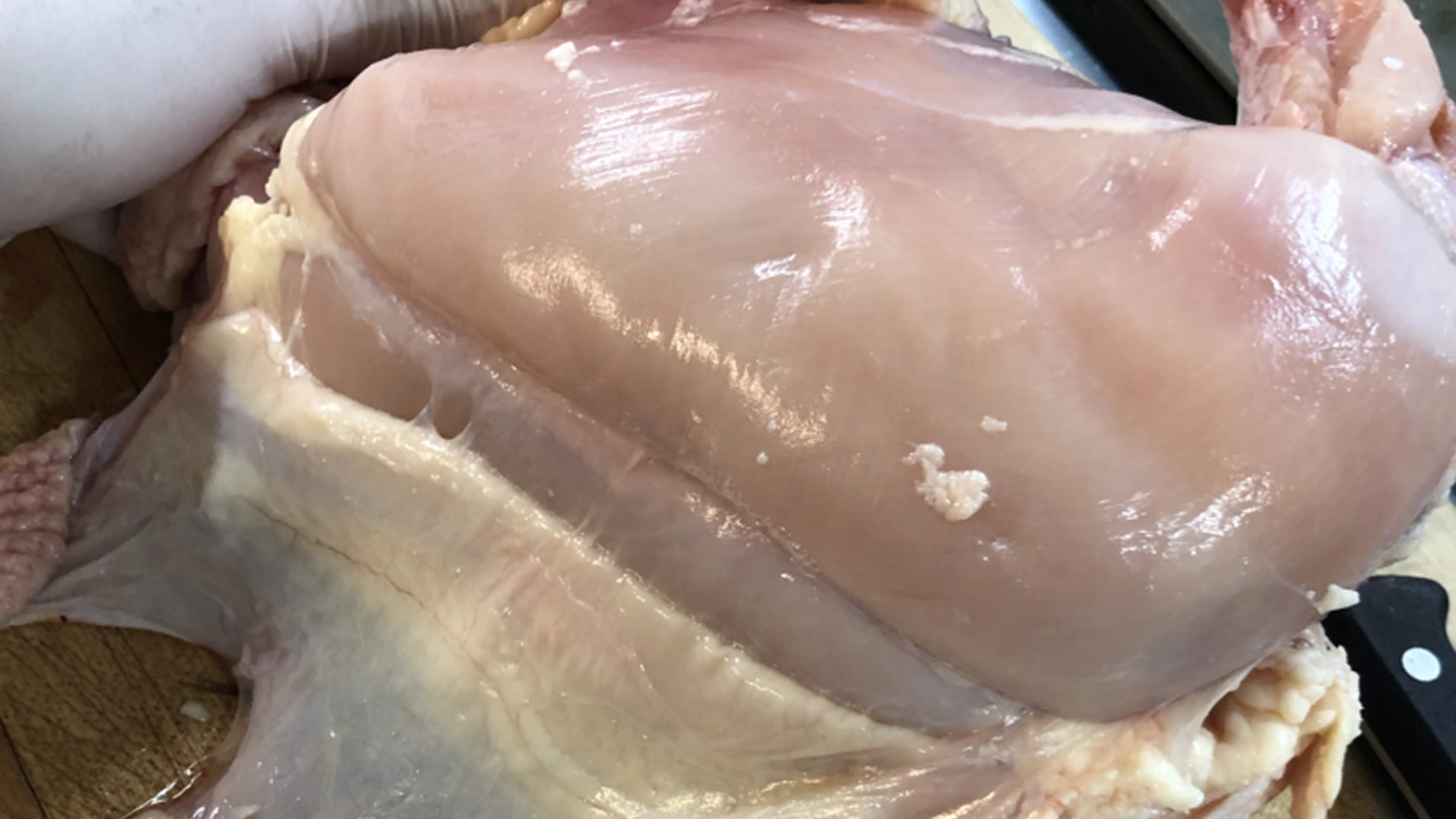 Once the skin is frozen, use a long, serrated knife to remove as much excess fat from the skin without damaging it. The goal is to get a thin, almost transparent layer of chicken skin without large pockets of fat. Reserve the skin in a cool place until needed (40 degrees F or below).