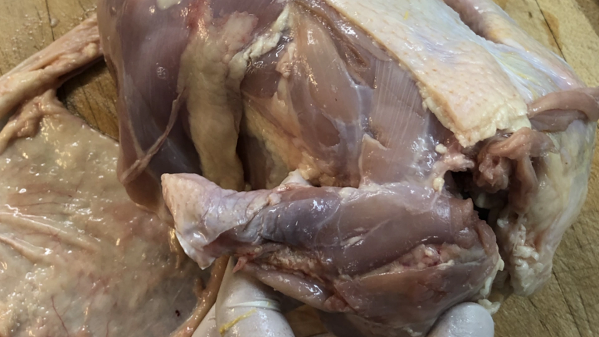 Working your way around the entire chicken, separate the skin from the meat. You will need to trim around the wing joints and the legs to remove the skin.