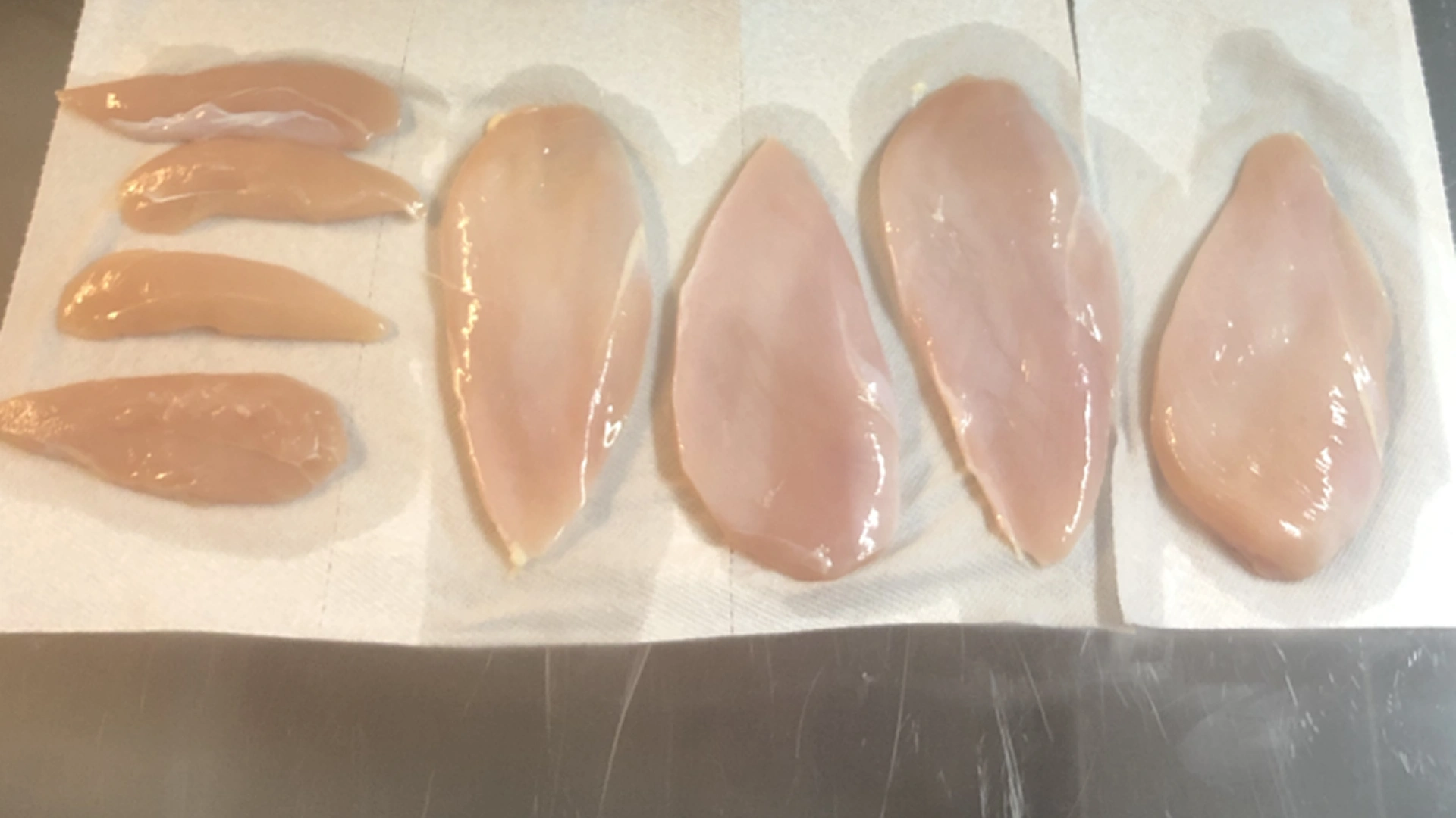 Trim any excess fat or cartilage from the breast. Trim off any thick part of the chicken so that it is no thicker than 1/2 inch, and about 3 inches wide at its widest part. At this point, begin weighing out 16 ounces of lean chicken trim for the mousse. This will come from the chicken breast, and you can use the thighs if you need to as well. The breast will line the inside of the mold, so it should be sized appropriately to produce a uniform thickness around the finished piece.