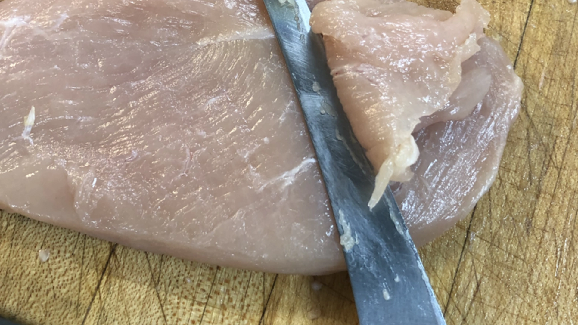 Remove the tenderloin from the breast and remove the tendon from the tenderloin, discarding the tendon.