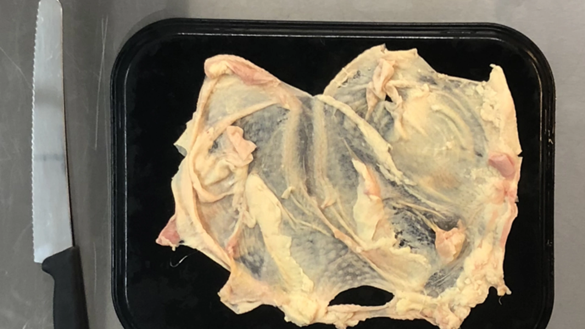 Next, lay the skin of the chicken completely flat on a plastic cafeteria tray for easy cleaning. Freeze the skin so that the excess fat deposits on the skin can be shaved off easily.