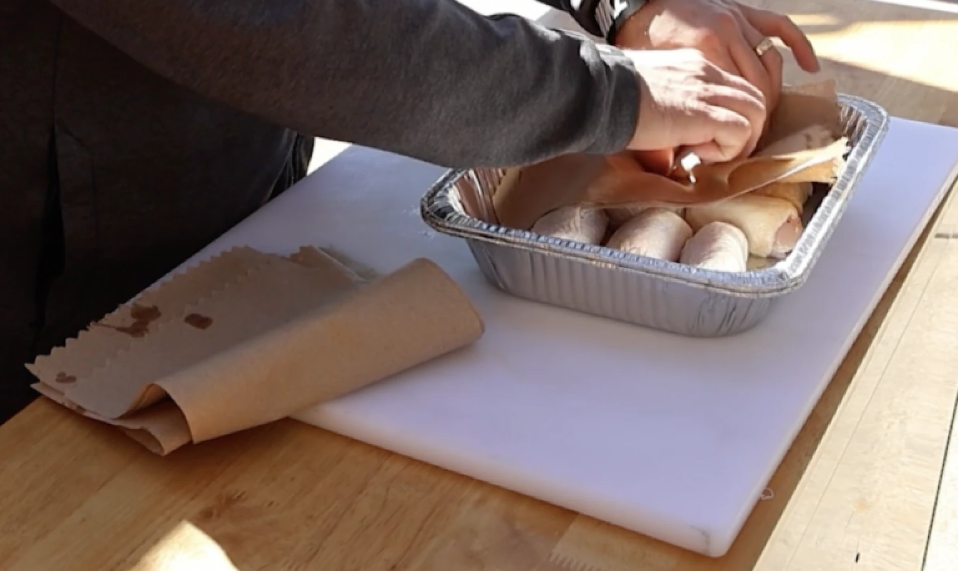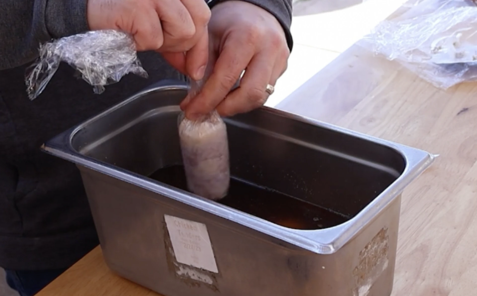 After two hours, remove the chicken thighs from the brine, rinse the chicken, dry them, and then rewrap the chicken thighs.