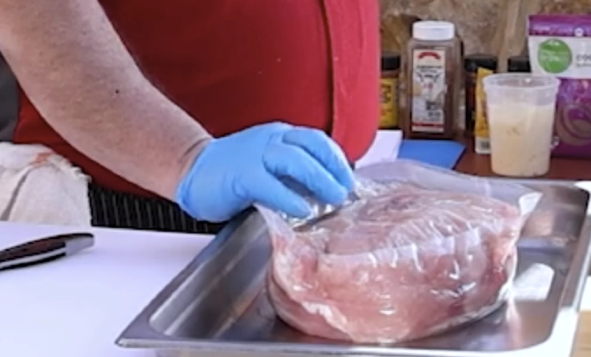 Apply the rub, and massage it into the turkey breast. Note: the mayo will start to turn orange as the spices absorb into the mayonnaise, and you shouldn't see any "dry" rub on the turkey breast!