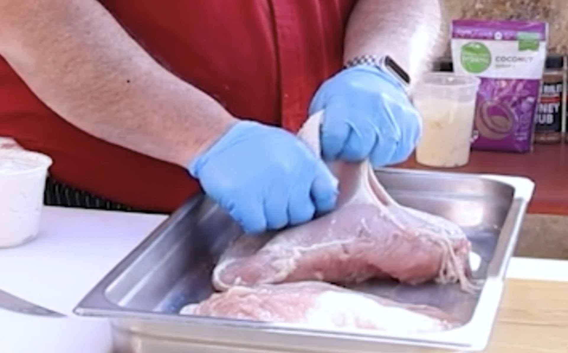 Remove the skin from the turkey breast. (You should be able to pull the skin off the breast without using a knife.)