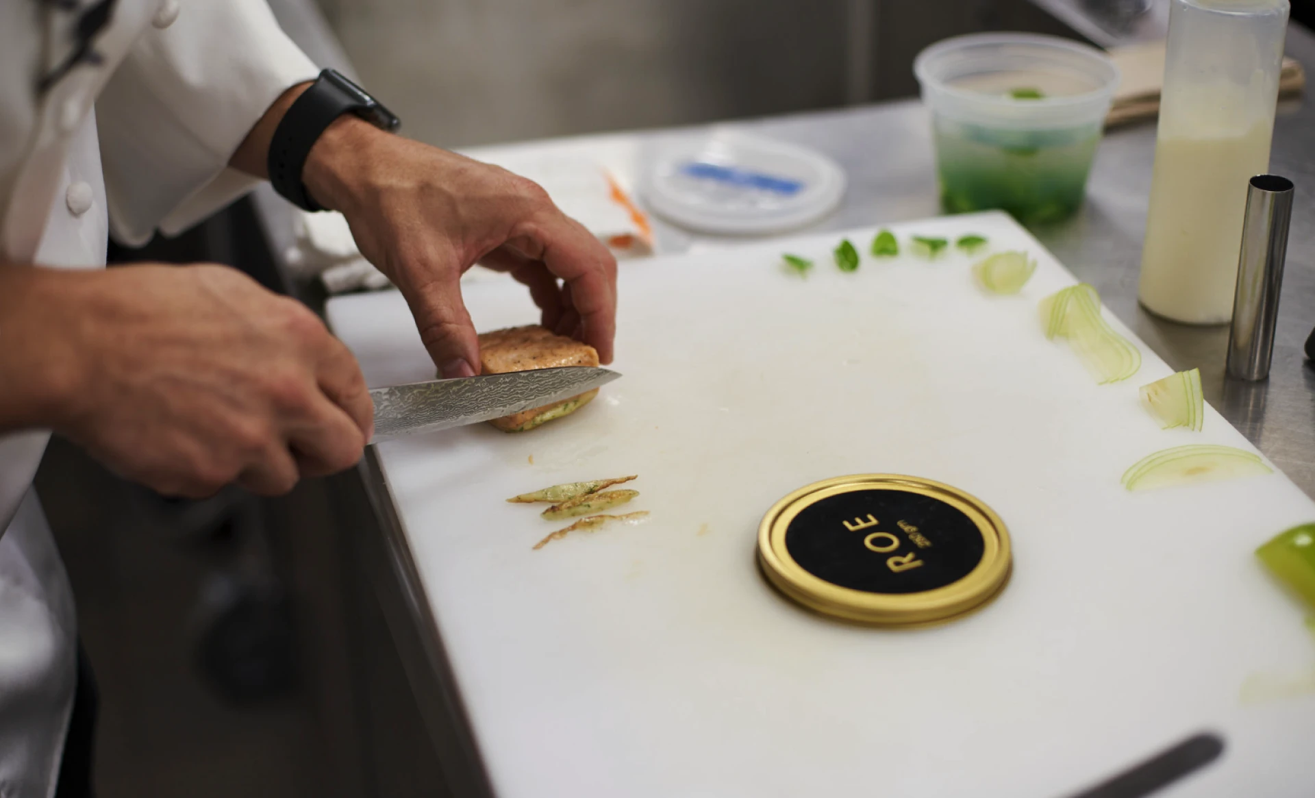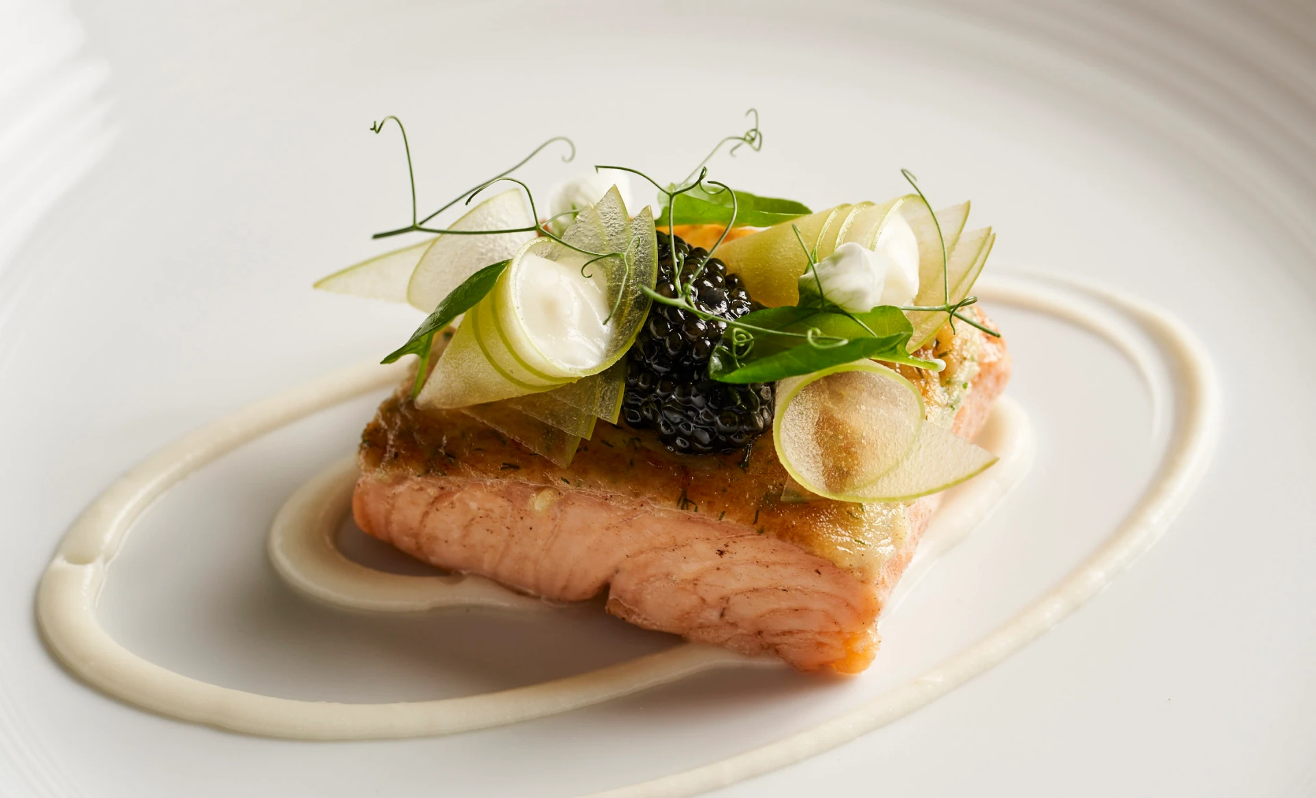 Here, the classic pancake is replaced with a delicate scallop mousse blended with cream, seasonings, and a touch of crĂšme fraĂźche, then folded with Yukon gold potato purĂ©e and whipped egg whites. Instead of serving the blini on its own, Phil uses this mousse mixture as a topping over fillets of salmon, creating a light, savory crust when cooked. He plates the dish with Rosendaleâs apple purĂ©e, Sterling caviar, pea tendrils, and thinly curled apple slices, bringing acidity, richness, and freshness into balance. The result is a modern expression of a timeless tradition, transformed into a fine dining presentation.