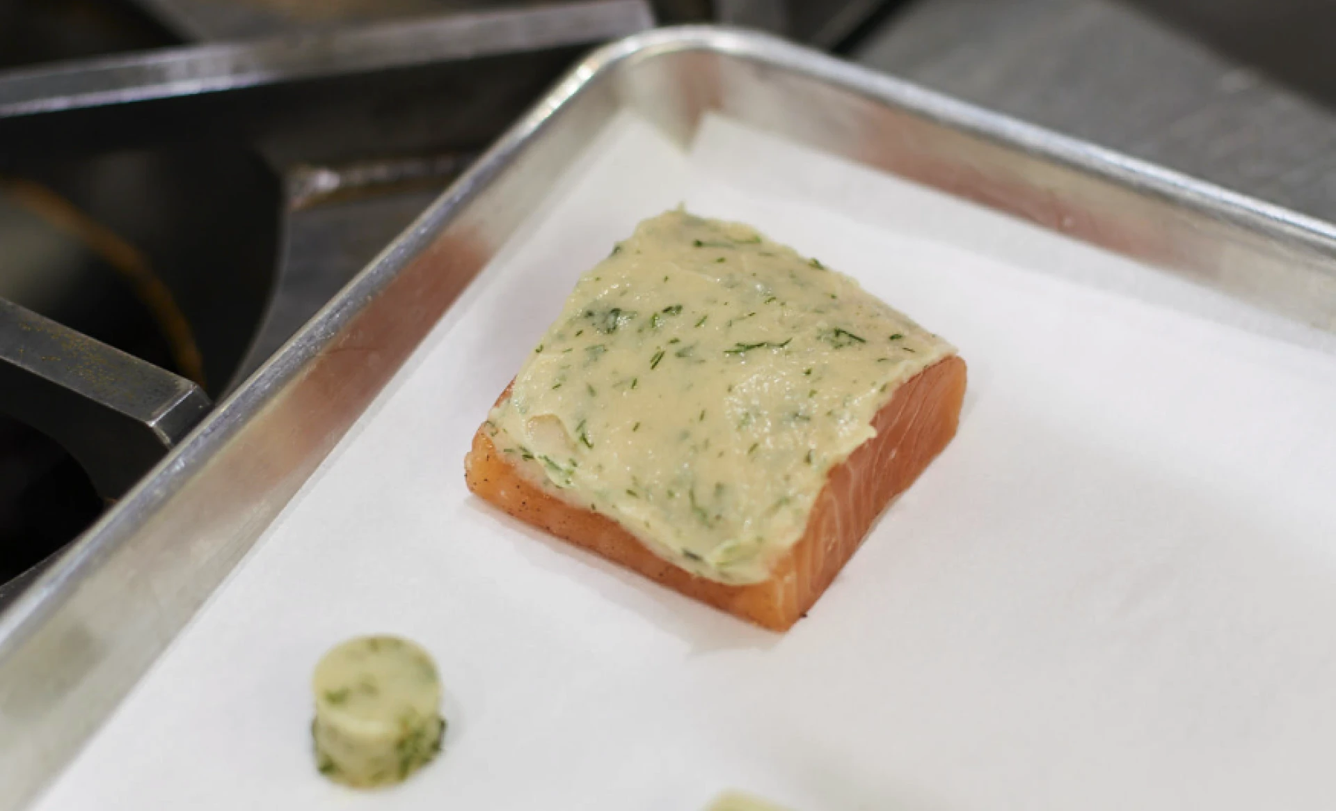 Spread 2 mm of blini mixture over each salmon fillet.
