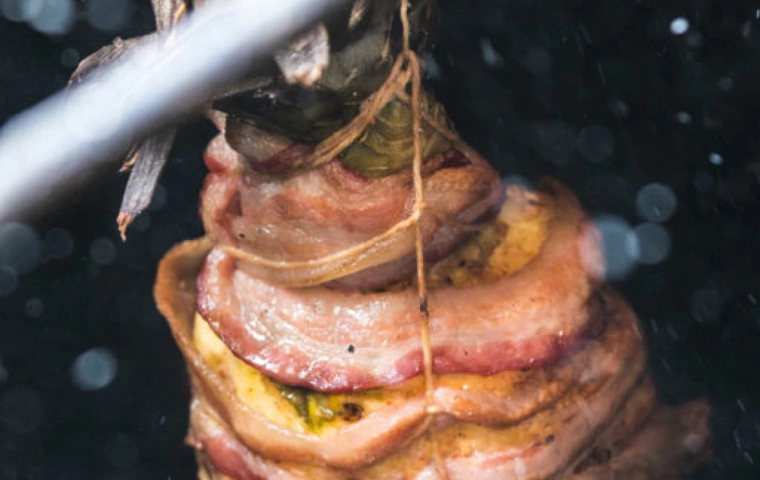 To smoke the pineapple, stand the pineapple upright in a drum smoker and smoke at 240°F for 3–5 hours. Make sure to rotate the pineapple to ensure the bacon is crisping all the way around.