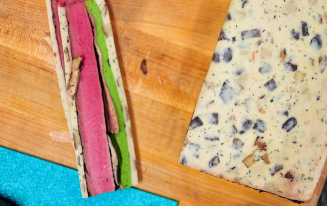 Split the tenderloin in half lengthwise, dust with TG and place on top of the mushroom mousse mat. Then add a layer of chlorophyll mousse, just covering the tenderloin.