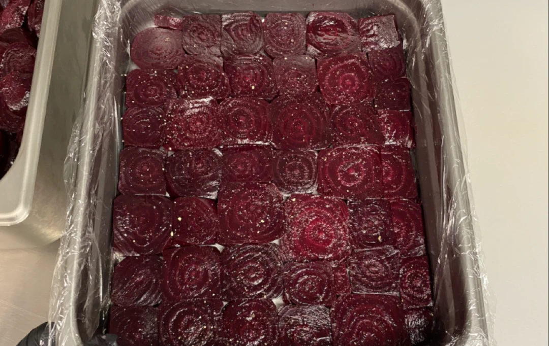 After the beets have cooled, peel them and then cut them to the desired shape. Refrigerate until needed.