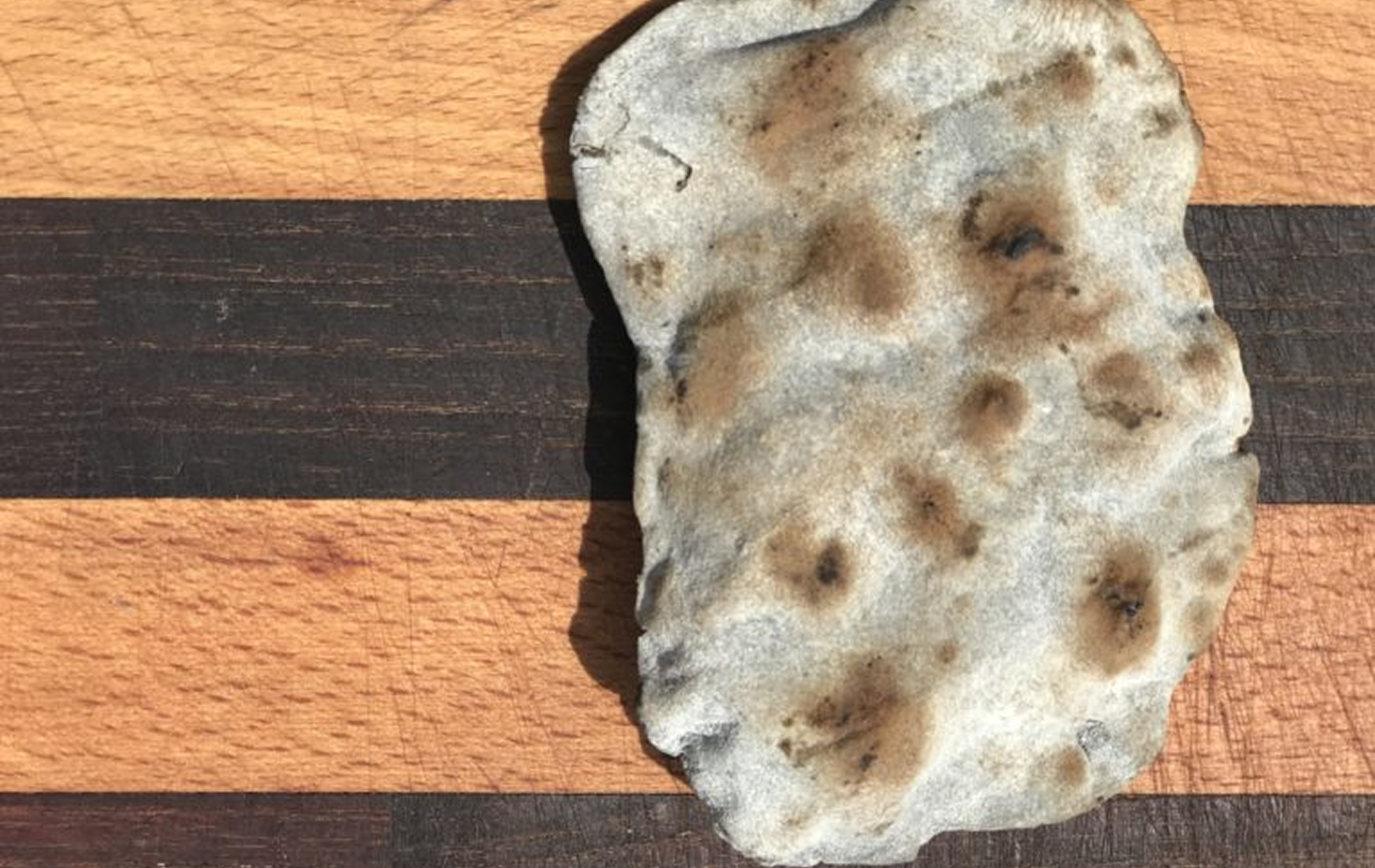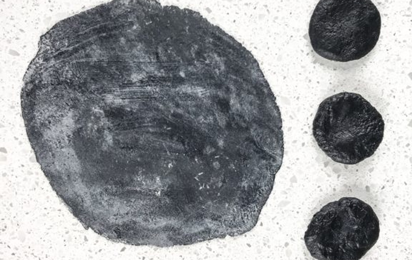 Place the dough on a grill and let it cook for 1–2 minutes on each side. Keep in mind that the deep black color will slightly fade, similar to when you burn charcoal.
