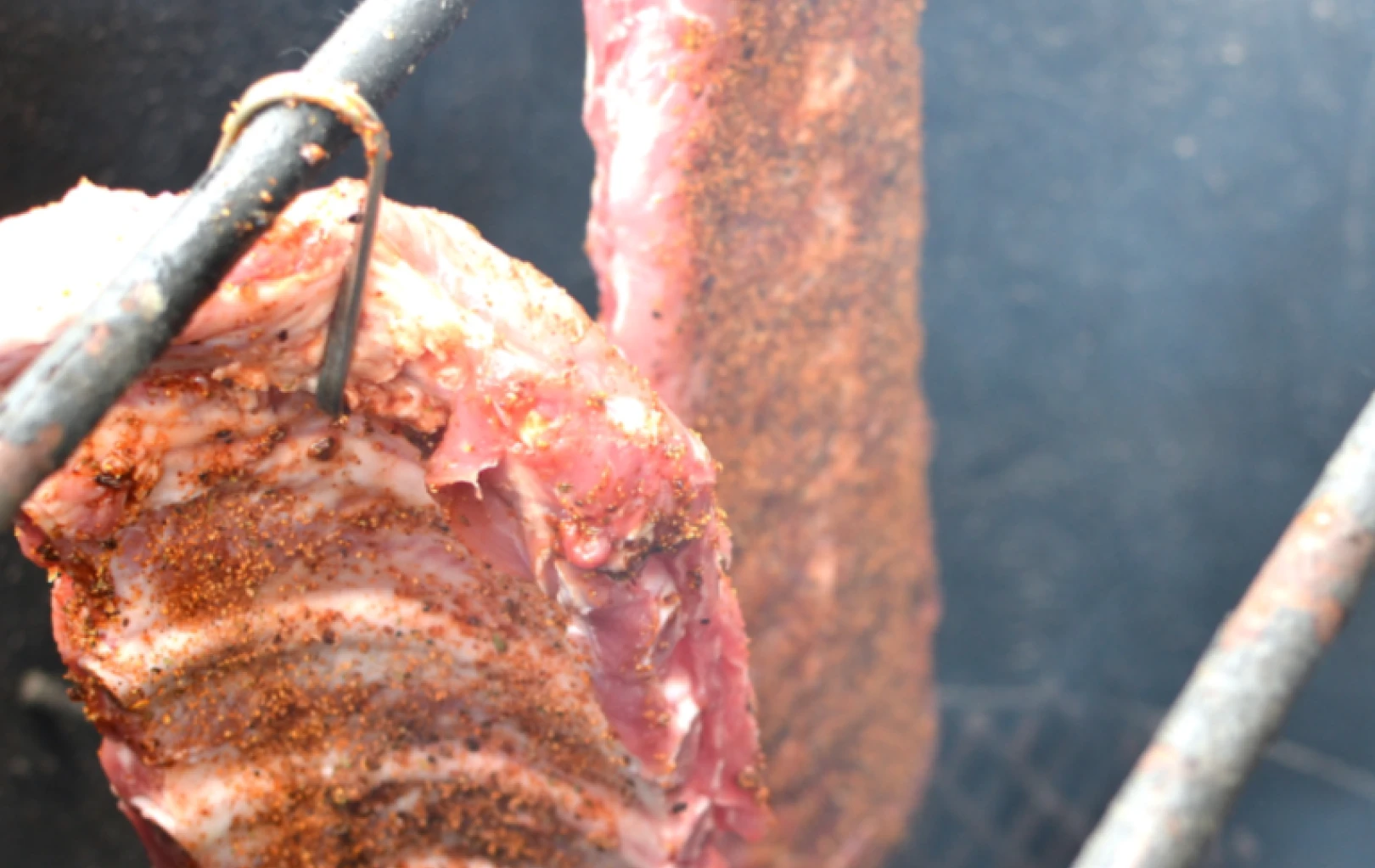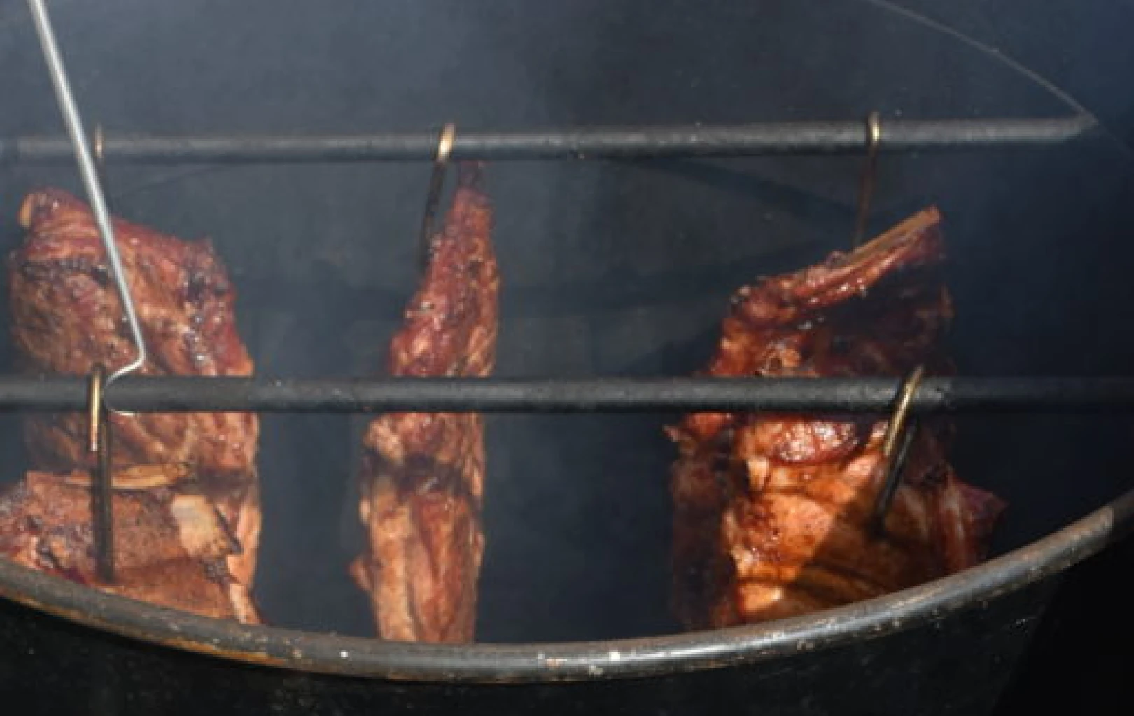 1. Set the drum smoker up to cook ribs using the rib bar insert. Use 2 lumps of hickory wood and a full basket of charcoal. Set the temp to about 275°F with the ribs hanging over the fire.