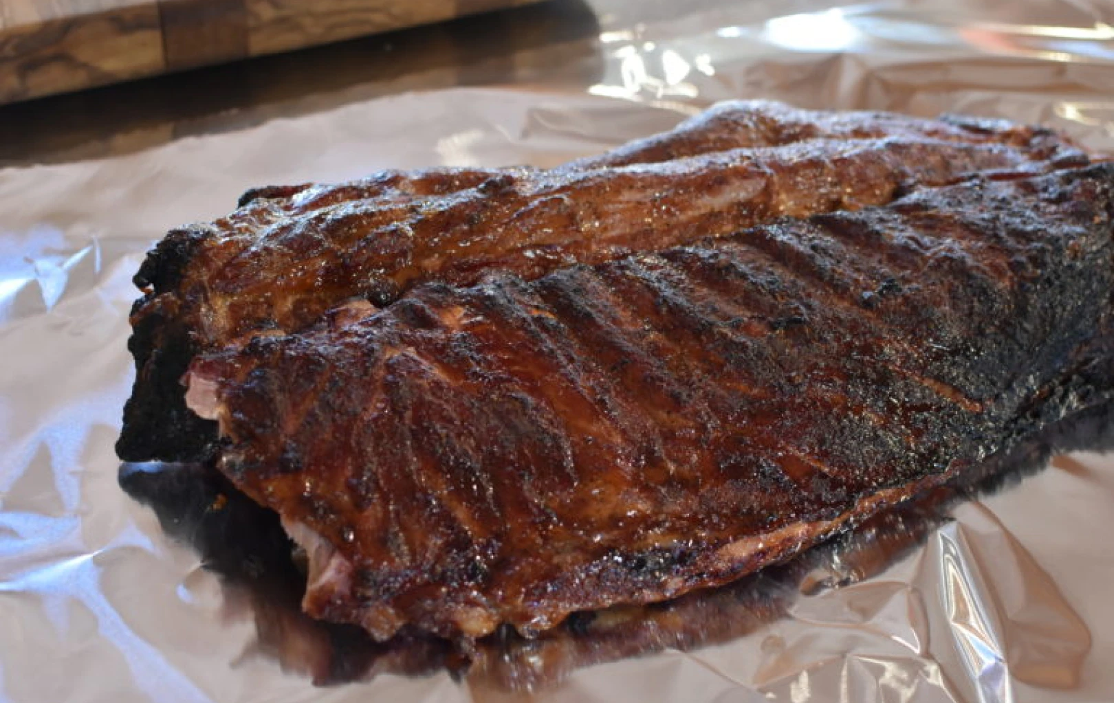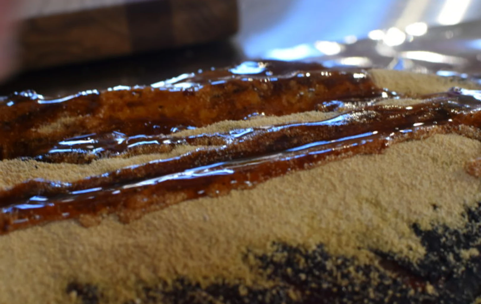 Remove the ribs from the drum smoker using the rib handling hooks. Lay the ribs on a sheet of foil and proceed to apply the wrap mixture.