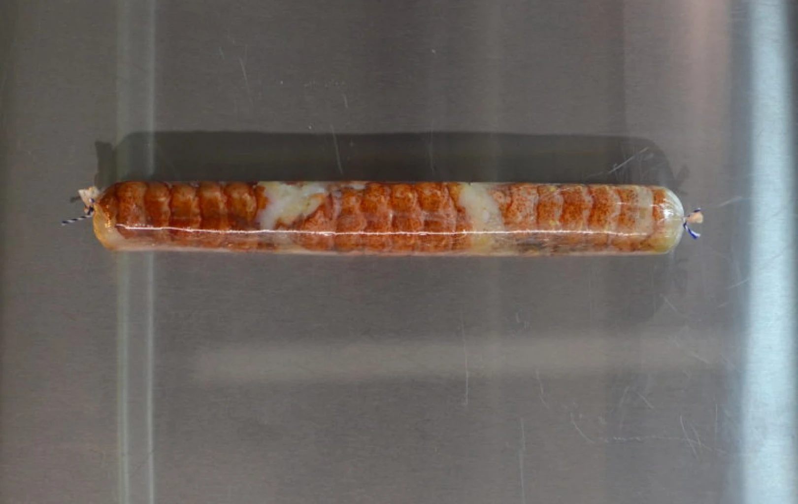 Pipe the lobster mousse over the tail meat evenly. Roll the terrine in a cylindrical shape and then press into a half tunnel PVC mold fitter with a flat bottom of plexiglass. The PVC mold helps maintain the shape while building the terrine and while it is cooking. You may remove the terrine from the mold to finish wrapping it and then set back in the mold during cooking.