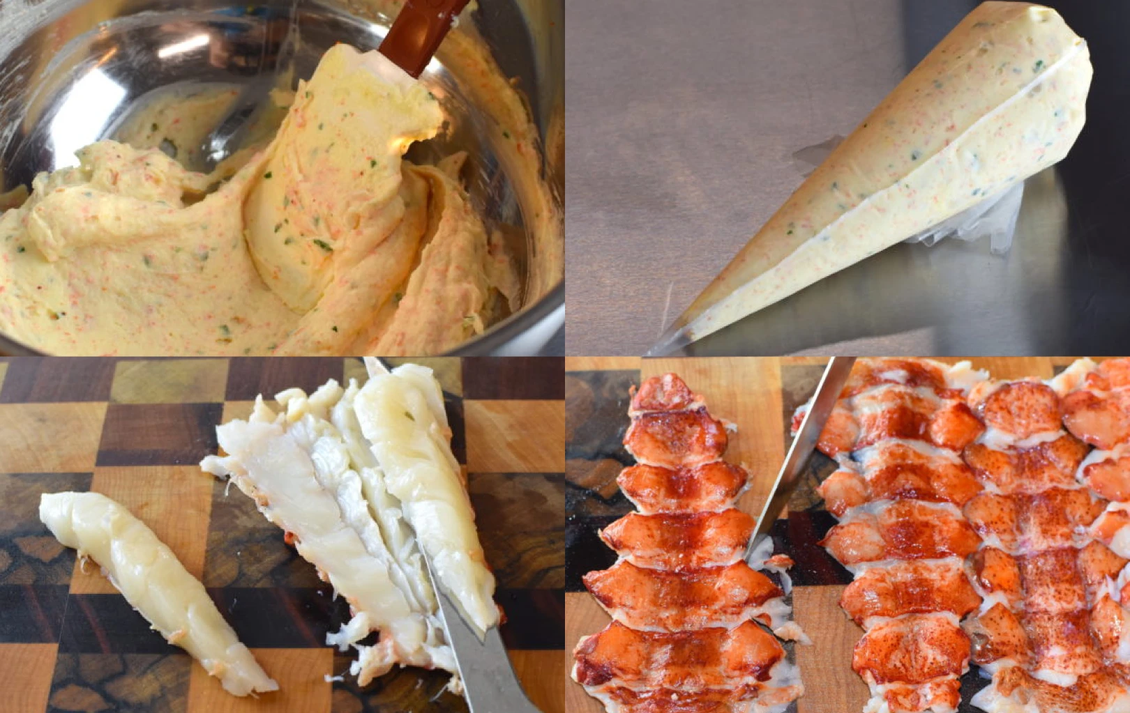 To prepare the tails, place them colored side down on a cutting board. Slice through both "loins" of the lobster, being sure to not cut all the way through the lobster tail. Cut away both "loins" from the tail and reserve. Repeat this with each tail.