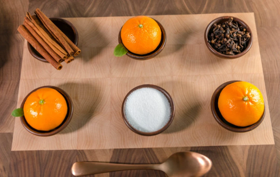 Add the orange quarters, cinnamon sticks and sugar and mix well. Heat over medium-low heat, stirring constantly to mix the sugar well so that the ingredients release their aroma as the sugar dissolves.