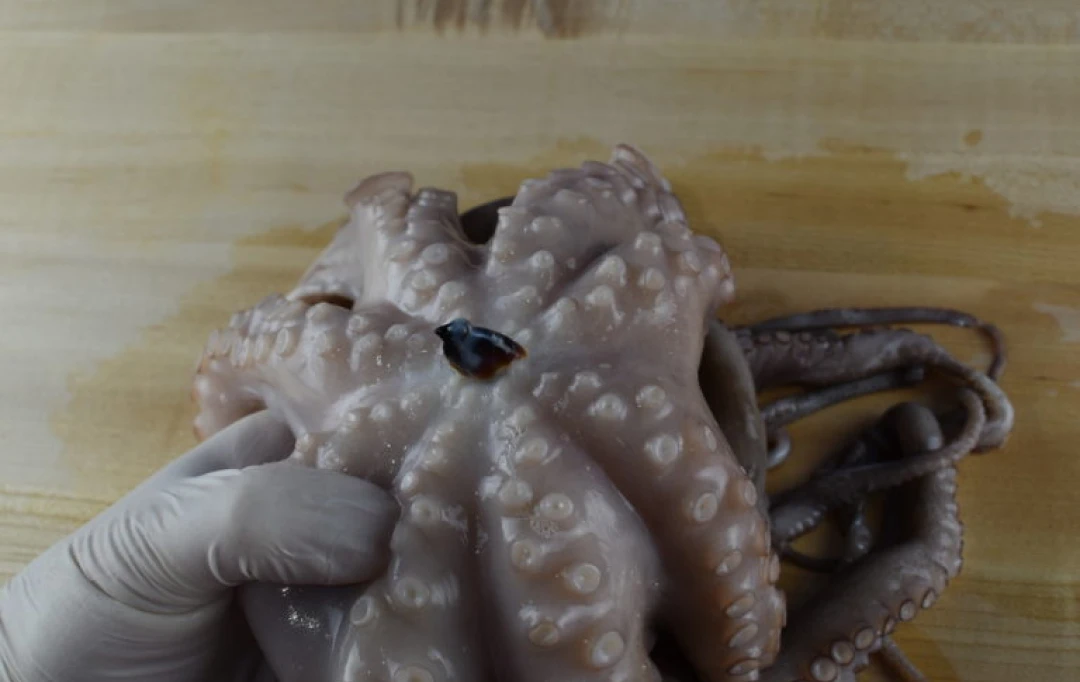 Locate the beak where the tentacles start. It is black and looks similar to a bird’s beak. The beak is used by the octopus for predation and is inedible.