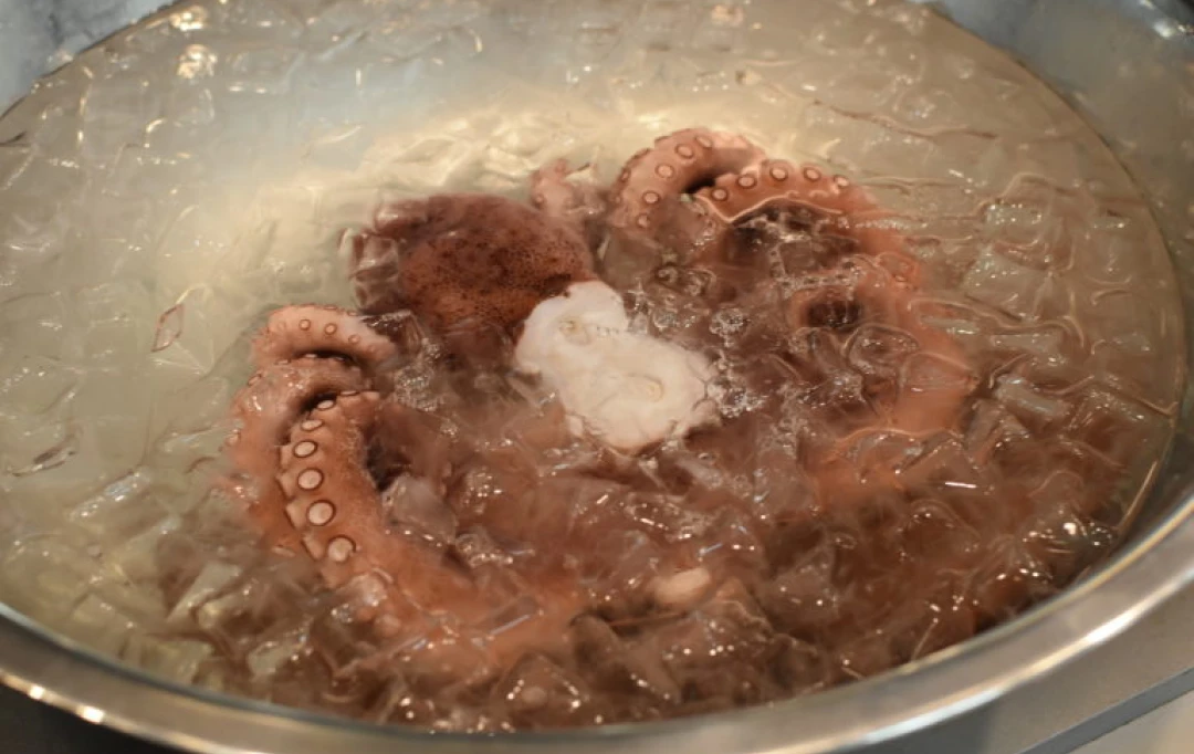 Remove the octopus from the water and place in the ice bath to stop the cooking.