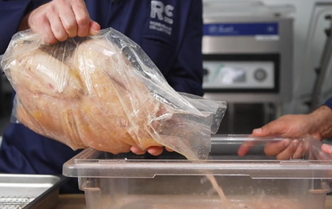 Place the whole bird into a vacuum bag with a little bit of whole butter and some chicken stock.