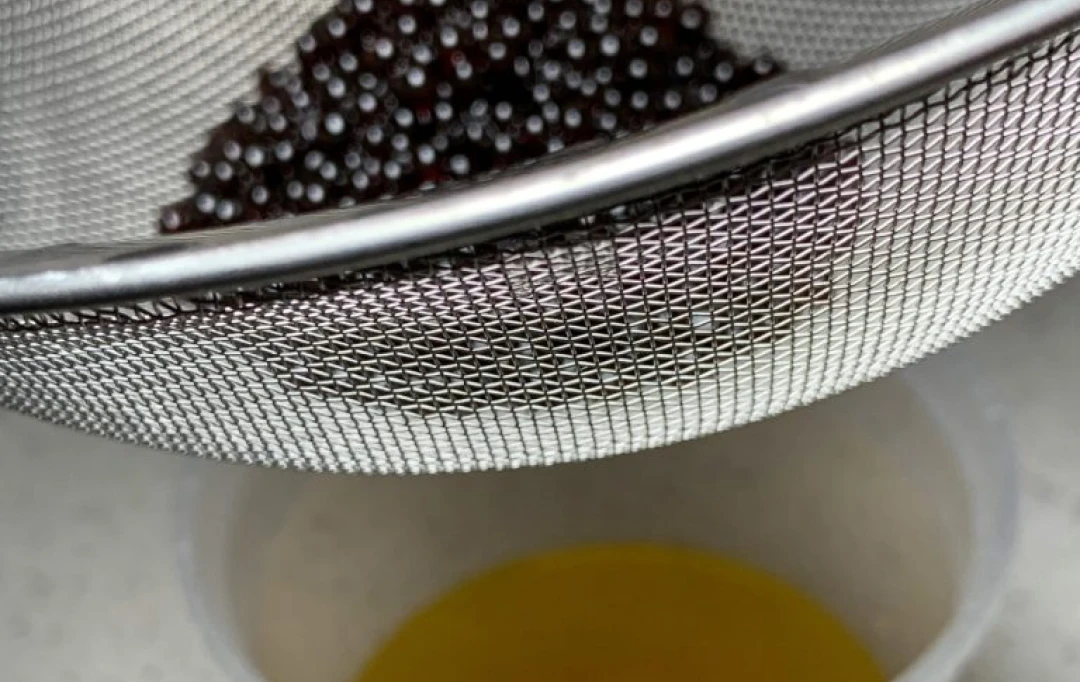 Strain the spheres with a fine mesh strainer. Leave in the strainer for about 2 minutes to drain any excess oil from the spheres.