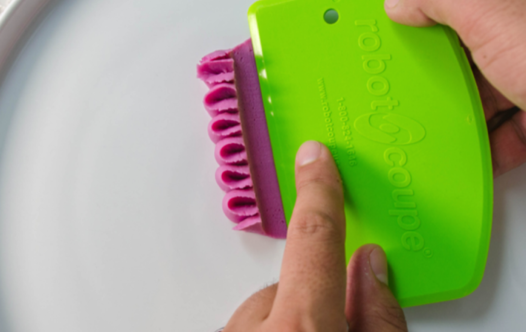 Using a scraper, press down on one half of the purée and gently spread to the side as shown in the photo.