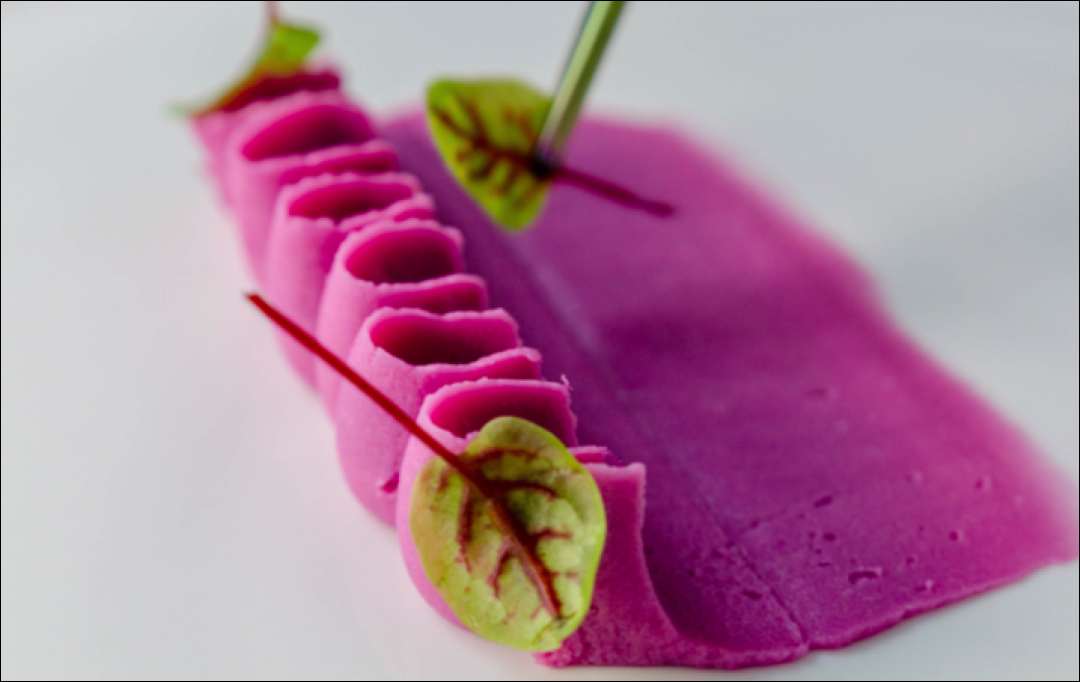 2. Using tweezers, place the yuzu-blanched red ribbon sorrel leaves to decorate the potato purée and to add some citrus flavor.